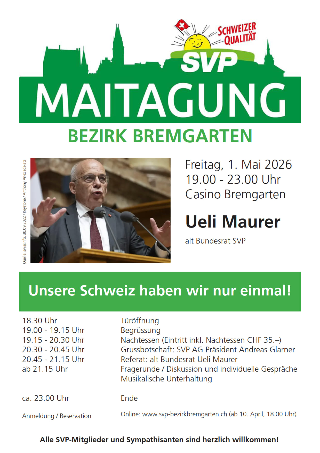 Anmeldungen für die 7. Maitagung können über ihre Ortspartei sowie ab dem 10. April über die Homepage der SVP des Bezirks Bremgarten gemacht werden